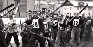 50er Jahre SAG-WinterspieleAufmarsch anlässlich der SAG-Winterspiele (vom Bahnhof Lend mit musikalischen Begleitung der Werksmusik über die Gasteinerstraße zum Start auf der Kögerlpiste) Das Ziel befand sich am alten Sportplatz. -